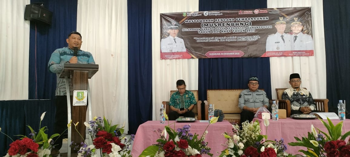 Kecamatan Gunung Puyuh, 4 Desember 2025 – Kelurahan Gunung Puyuh Kecamatan Gunung Puyuh Kota Sukabumi melaksanakan Musyawarah Perencanaan Pembangunan (Musrenbang) Tahun 2025 untuk penyusunan RKPD Tahun 2027 pada Kamis, 4 Desember 2025, bertempat di Ruang Pertemuan Gunung Puyuh. Kegiatan ini mengusung tema: